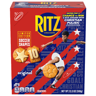 Host like a superstar with RITZ Soccer Shapes Original Crackers in fun soccer ball and jersey shapes featured on an appetizer tray! These limited edition, lightly salted crackers have the same rich, buttery flavor as RITZ Crackers original recipe round crackers, providing a creative canvas for a variety of sweet and savory toppings while being equally enjoyable on their own. Impress party guests with flaky, delicious RITZ snack crackers in soccer ball shapes with fun embossments illustrating soccer ball-stitching details and jersey shapes embossed with number 10. Simply add these buttery-flavored crackers to a cheese and crackers platter, or use them on a charcuterie board with soft and hard cheeses, olives, hummus, and dried fruits and nuts. In patriotic, soccer-inspired packaging that highlights professional soccer player Christian Pulisic, RITZ Soccer Shapes Crackers are a fantastic party food that’s sure to score on game day. Because these RITZ cracker party snacks are delicious on their own too, you'll want to keep them on hand for anytime you're in the mood for salty snack foods. Scan the pack’s QR code to enter for a chance to win a kickaround with Christian Pulisic or an epic vacation!*